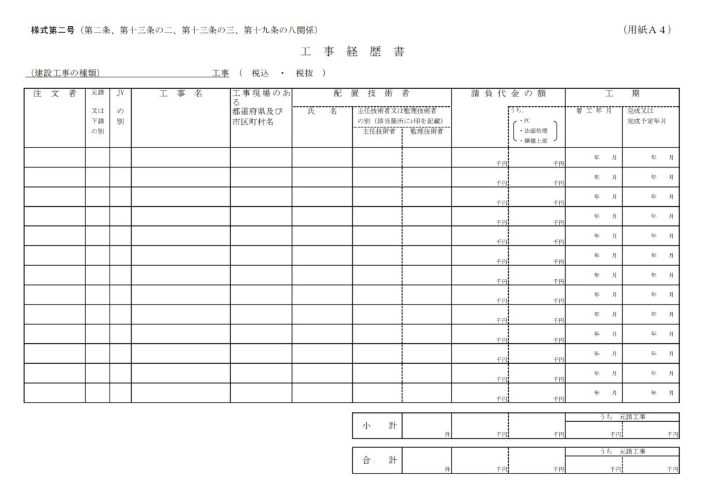 - 金額の一致: 工事経歴書(様式第二号)の「合計欄」に記入する金額は、別途作成する「直前3年の各事業年度における工事施工金額(様式第三号)」の各建設工事の合計金額と必ず一致させなければなりません。