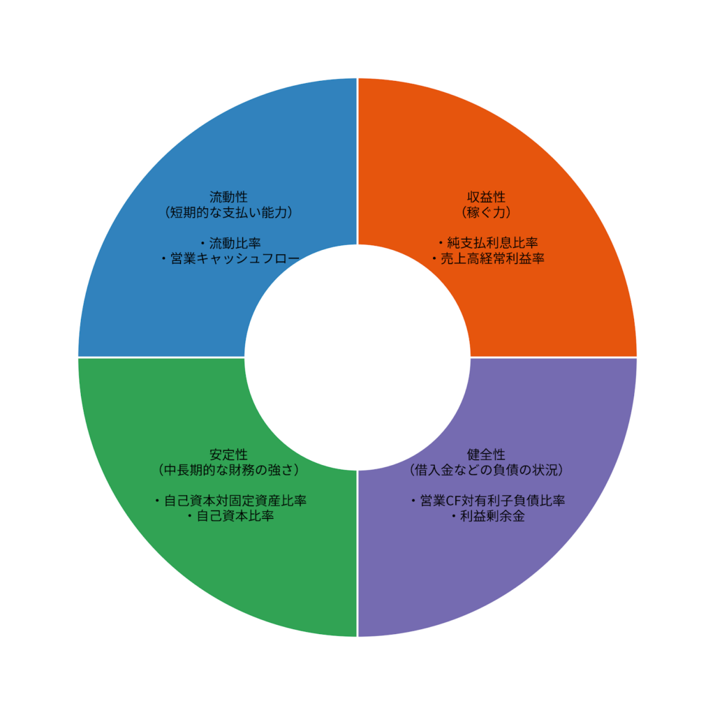 簡単に言うと「利益をしっかり出しているか」「借金に頼りすぎていないか」「手元の資金に余裕があるか」がチェックされます。