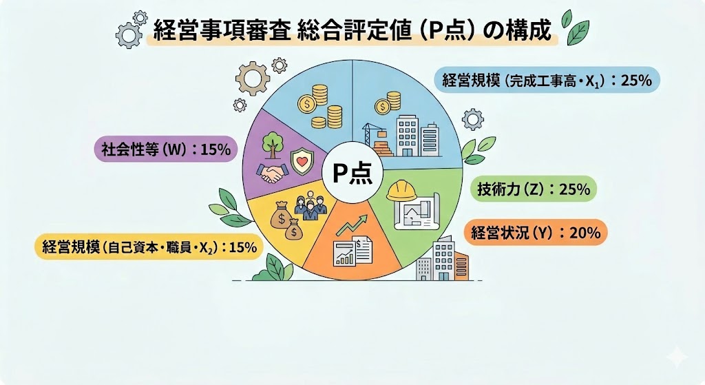 経営事項審査の際には、「経営規模(X1・X2)」「技術力(Z)」「社会性(W)」「経営状況(Y)」の4つの項目が評価の対象になり、総合評定値P点が算出されます。